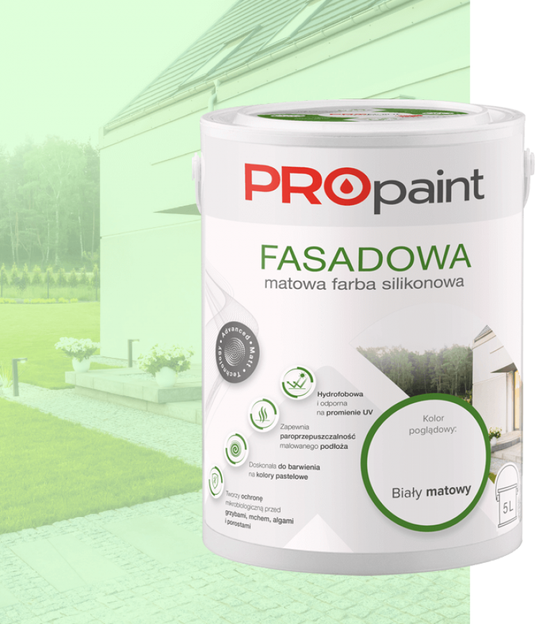 PROpaint FASADOWA matowa farba silikonowa jest przeznaczona do dekoracyjno-ochronnego malowania elewacji budynków, a w szczególności tynków cementowych, cementowo-wapiennych, cienkowarstwowych tynków mineralnych i dyspersyjnych oraz betonu, cegieł i pustaków ceramicznych.