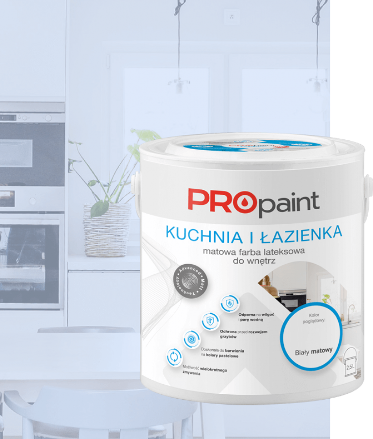 PROpaint KUCHNIA I ŁAZIENKA matowa farba lateksowa do wnętrz jest przeznaczona do dekoracyjno-ochronnego malowania kuchni i łazienek, a w szczególności tynków cementowych, cementowo-wapiennych, cienkowarstwowych tynków mineralnych i dyspersyjnych oraz podłoży gipsowych, betonu, cegieł, pustaków ceramicznych i płyt gipsowo-kartonowych.